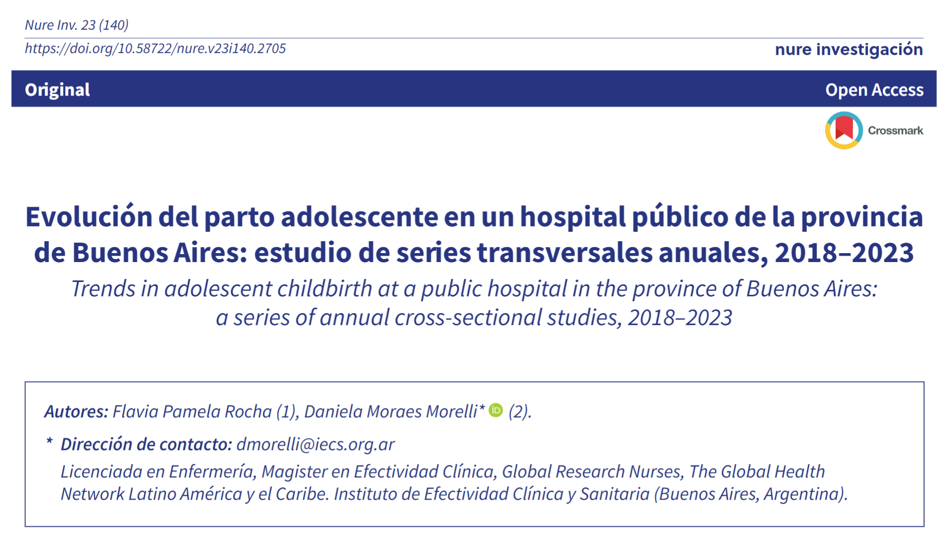 Se encuentra publicado en la Revista NURE, número 140 (febrero–marzo 2026), el artículo científico Evolución del parto adolescente en un hospital publico de la Provincia de Buenos Aires, 2018 - 2023.